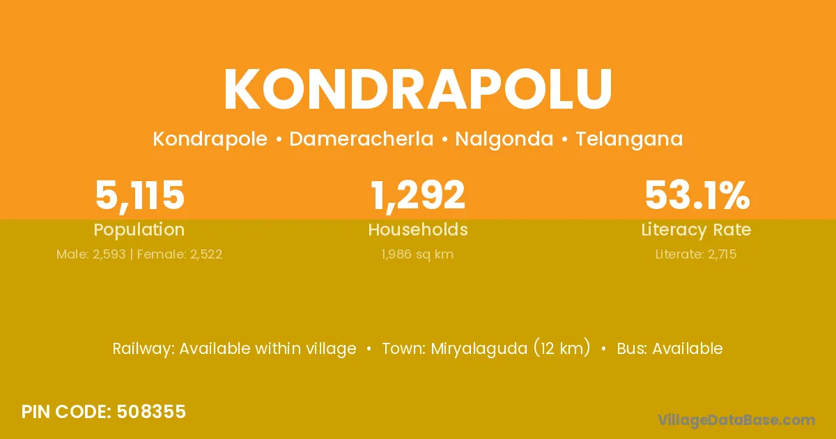 Miryalaguda (12 km) is the nearest town to Kondrapolu village for major economic activities and is located approximately 12 km away.