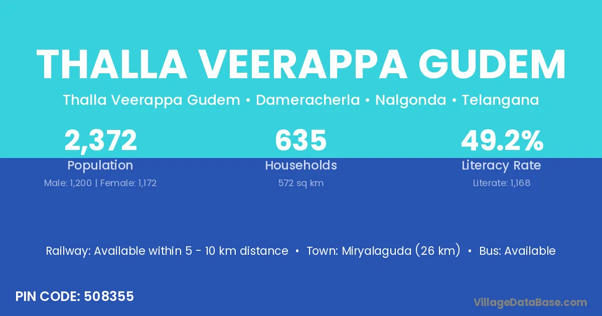 Miryalaguda (26 km) is the nearest town to Thalla Veerappa Gudem village for major economic activities and is located approximately 26 km away.