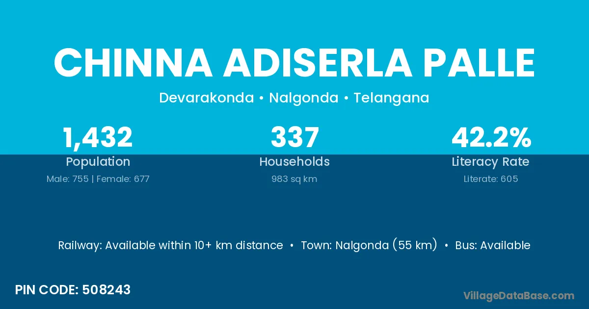 Nalgonda (55 km) is the nearest town to Chinna Adiserla Palle village for major economic activities and is located approximately 55 km away.