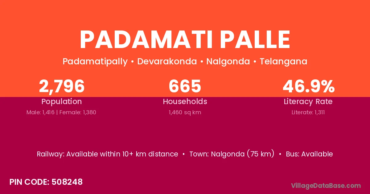 Nalgonda (75 km) is the nearest town to Padamati Palle village for major economic activities and is located approximately 75 km away.