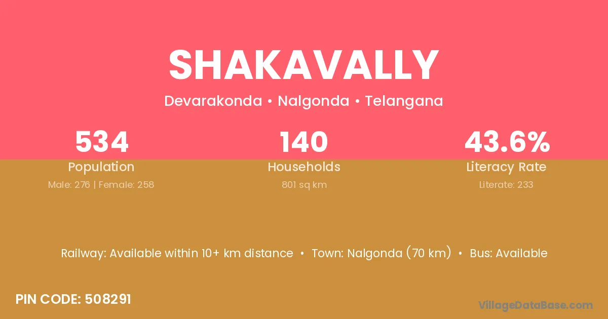 Nalgonda (70 km) is the nearest town to Shakavally village for major economic activities and is located approximately 70 km away.