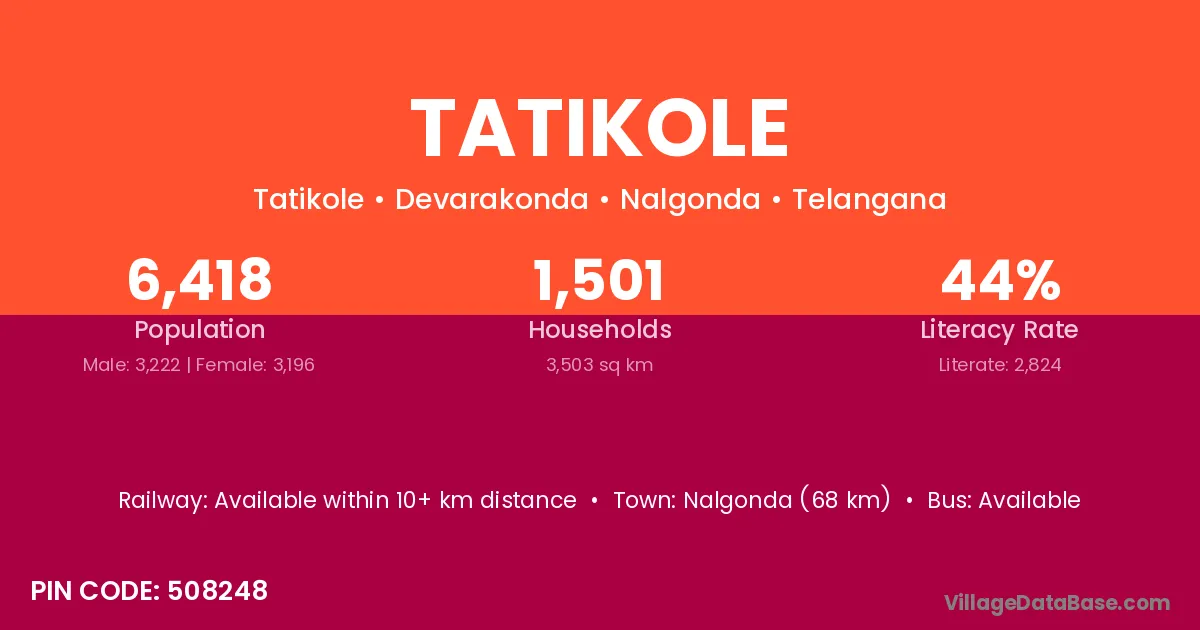 Nalgonda (68 km) is the nearest town to Tatikole village for major economic activities and is located approximately 68 km away.