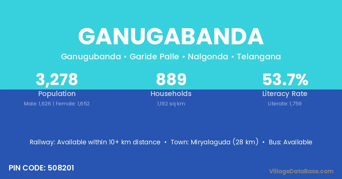 Miryalaguda (28 km) is the nearest town to Ganugabanda village for major economic activities and is located approximately 28 km away.