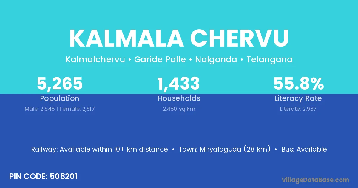 Miryalaguda (28 km) is the nearest town to Kalmala Chervu village for major economic activities and is located approximately 28 km away.