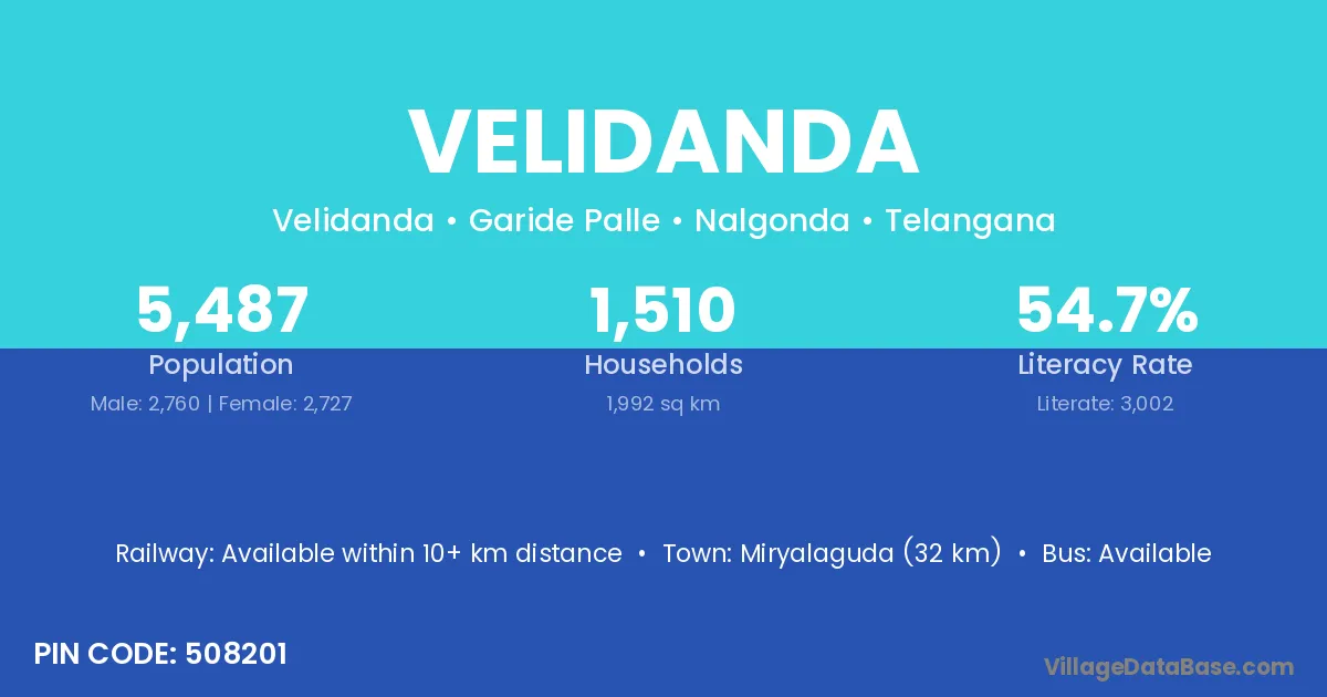Miryalaguda (32 km) is the nearest town to Velidanda village for major economic activities and is located approximately 32 km away.