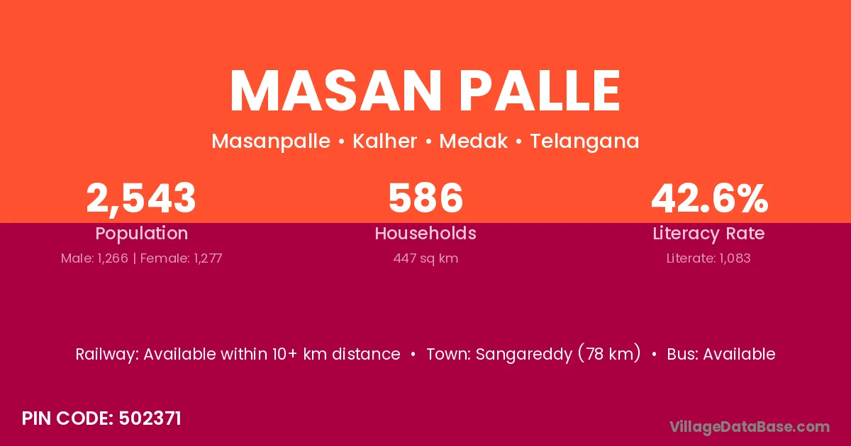 Jangaon (36 km) is the nearest town to Masan Palle village for major economic activities and is located approximately 36 km away.