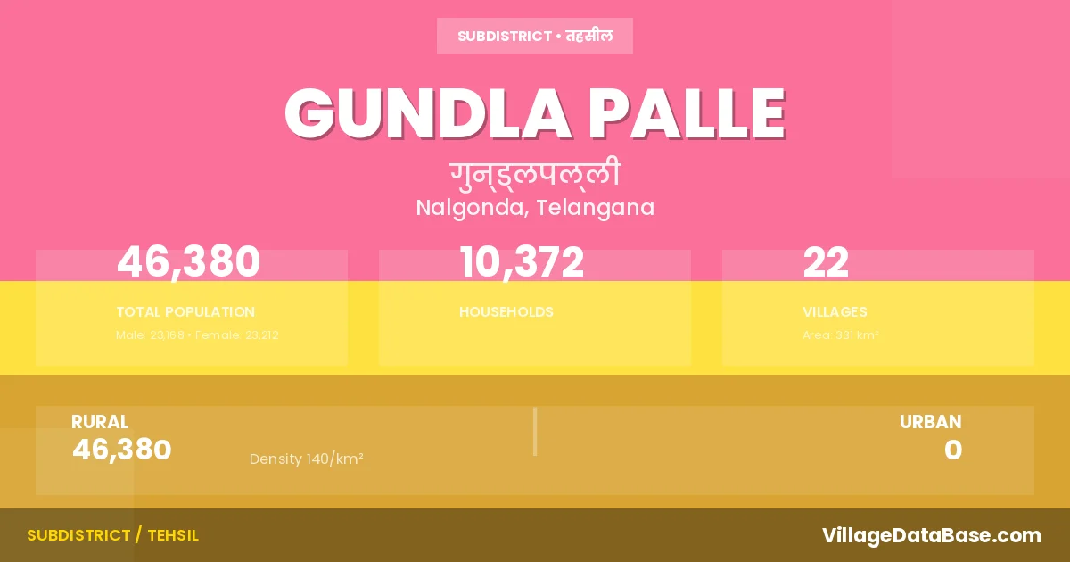 According to the 2011 census The total area of Gundla Palle Mandal is 331 km², with a population of 46380 people. The population density is 140 inhabitants per square kilometre, and there are approximately 10372 houses in the sub district.