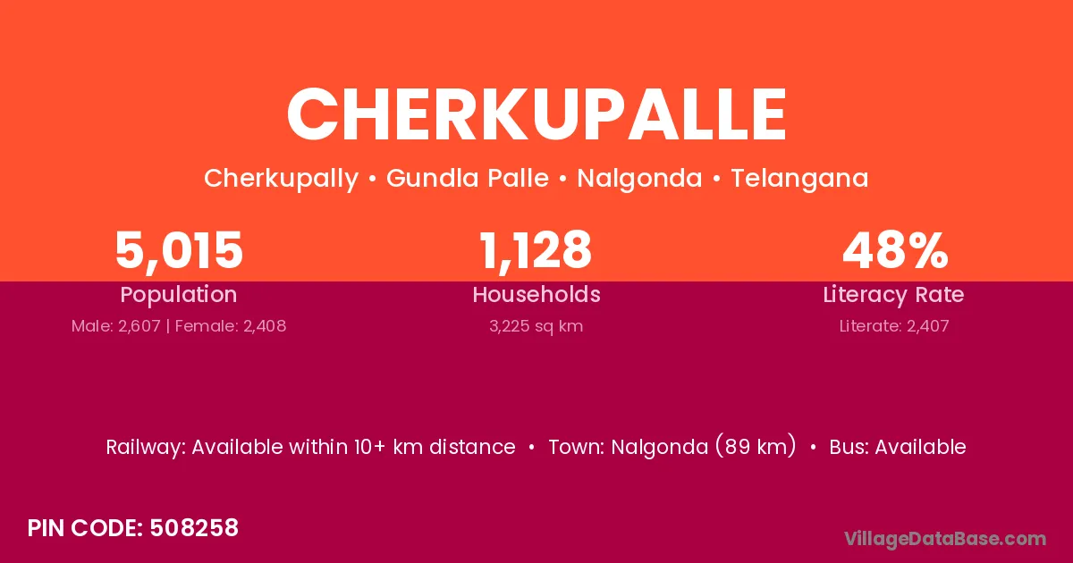 Nalgonda (89 km) is the nearest town to Cherkupalle village for major economic activities and is located approximately 89 km away.