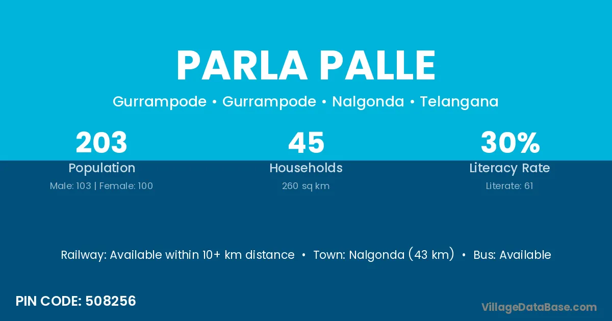 Nalgonda (43 km) is the nearest town to Parla Palle village for major economic activities and is located approximately 43 km away.