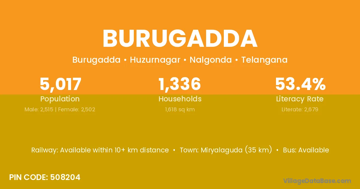 Miryalaguda (35 km) is the nearest town to Burugadda village for major economic activities and is located approximately 35 km away.