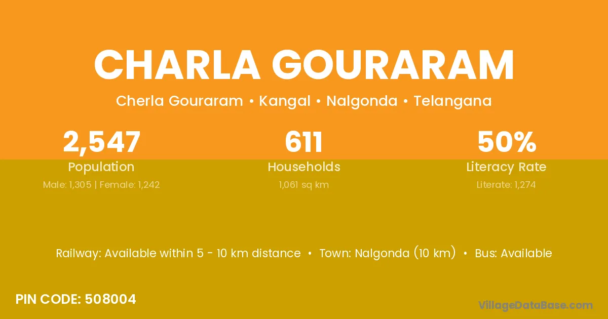 Nalgonda (10 km) is the nearest town to Charla Gouraram village for major economic activities and is located approximately 10 km away.