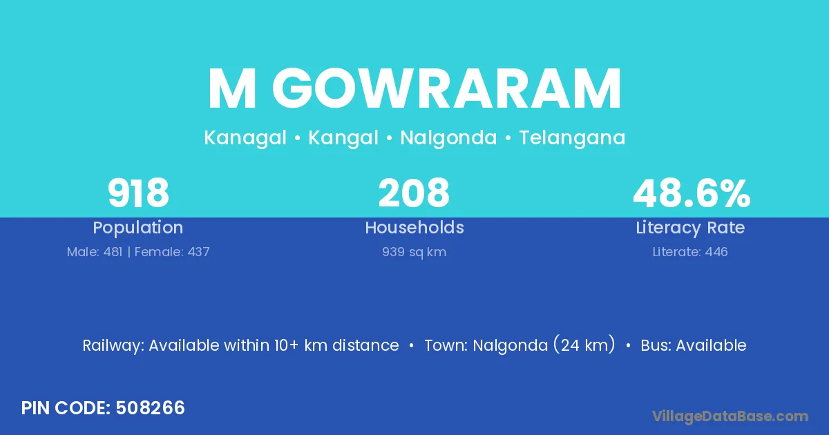 Nalgonda (24 km) is the nearest town to M Gowraram village for major economic activities and is located approximately 24 km away.