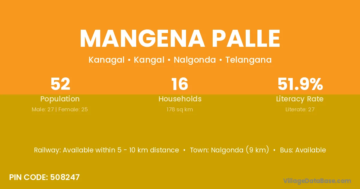 Nalgonda (9 km) is the nearest town to Mangena Palle village for major economic activities and is located approximately 9 km away.