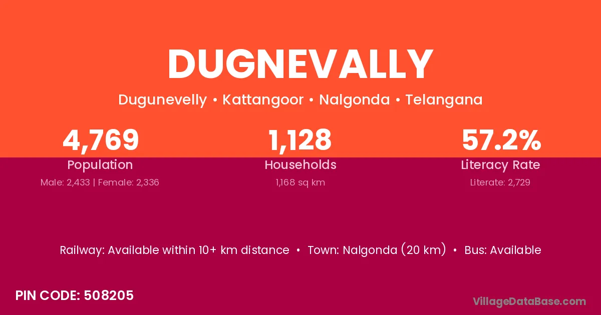 Nalgonda (20 km) is the nearest town to Dugnevally village for major economic activities and is located approximately 20 km away.