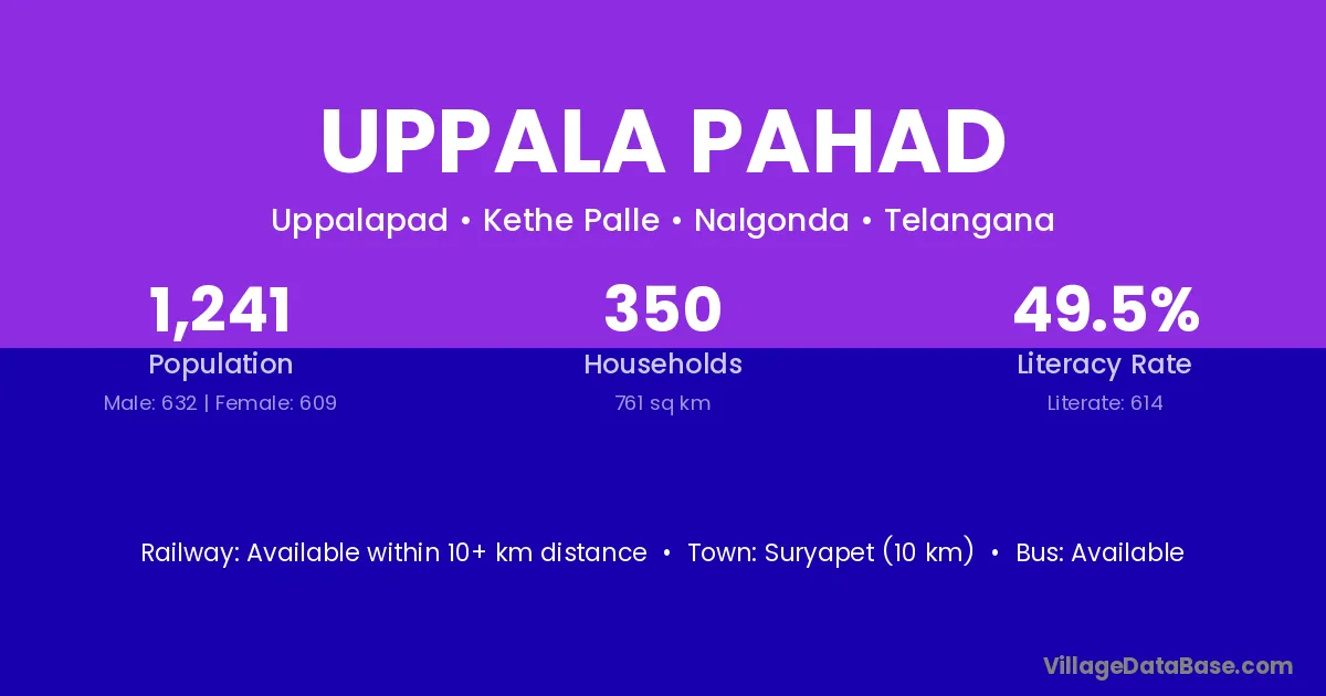 Suryapet (10 km) is the nearest town to Uppala Pahad village for major economic activities and is located approximately 10 km away.