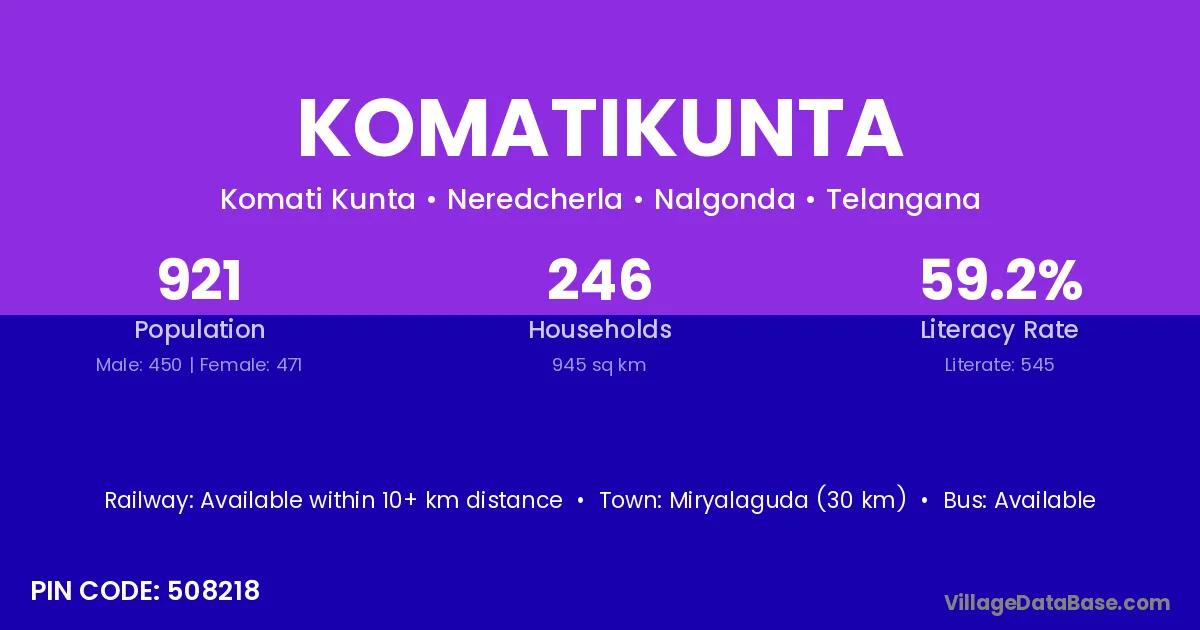 Bhongir (24 km) is the nearest town to Komatikunta village for major economic activities and is located approximately 24 km away.