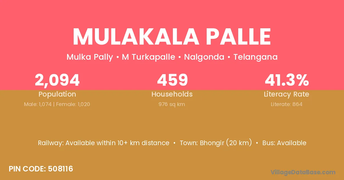Bhongir (20 km) is the nearest town to Mulakala Palle village for major economic activities and is located approximately 20 km away.