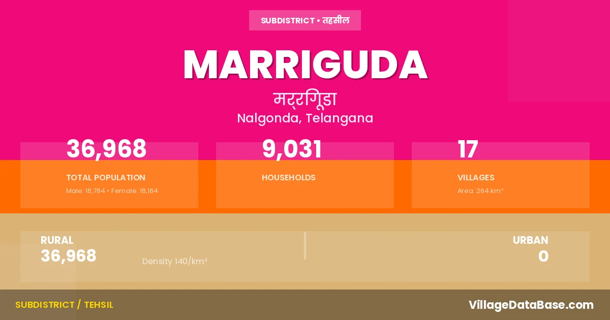According to the 2011 census The total area of Marriguda Mandal is 264 km², with a population of 36968 people. The population density is 140 inhabitants per square kilometre, and there are approximately 9031 houses in the sub district.