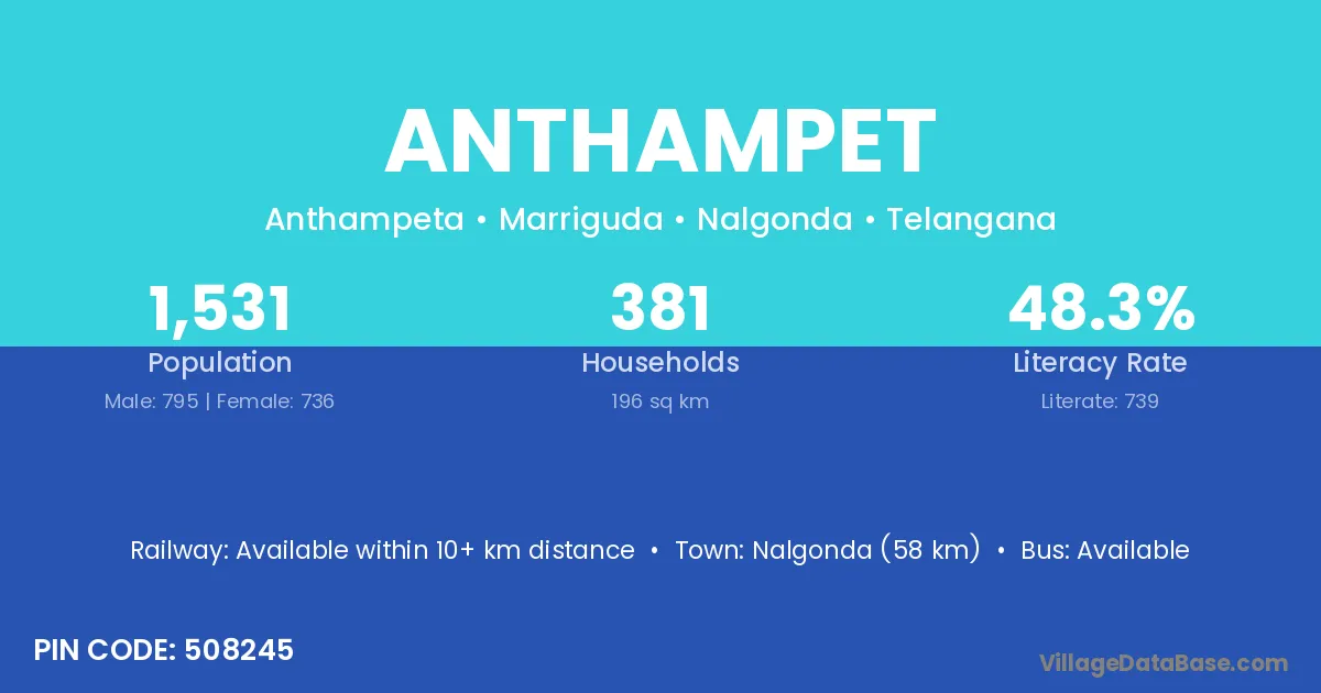 Nalgonda (58 km) is the nearest town to Anthampet village for major economic activities and is located approximately 58 km away.
