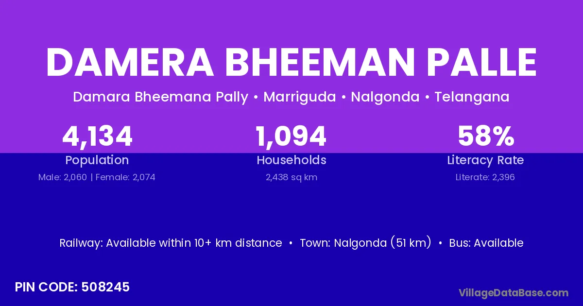 Damera Bheeman Palle village has a total population of 4,134 people, of which 2,060 are males and 2,074 are females.