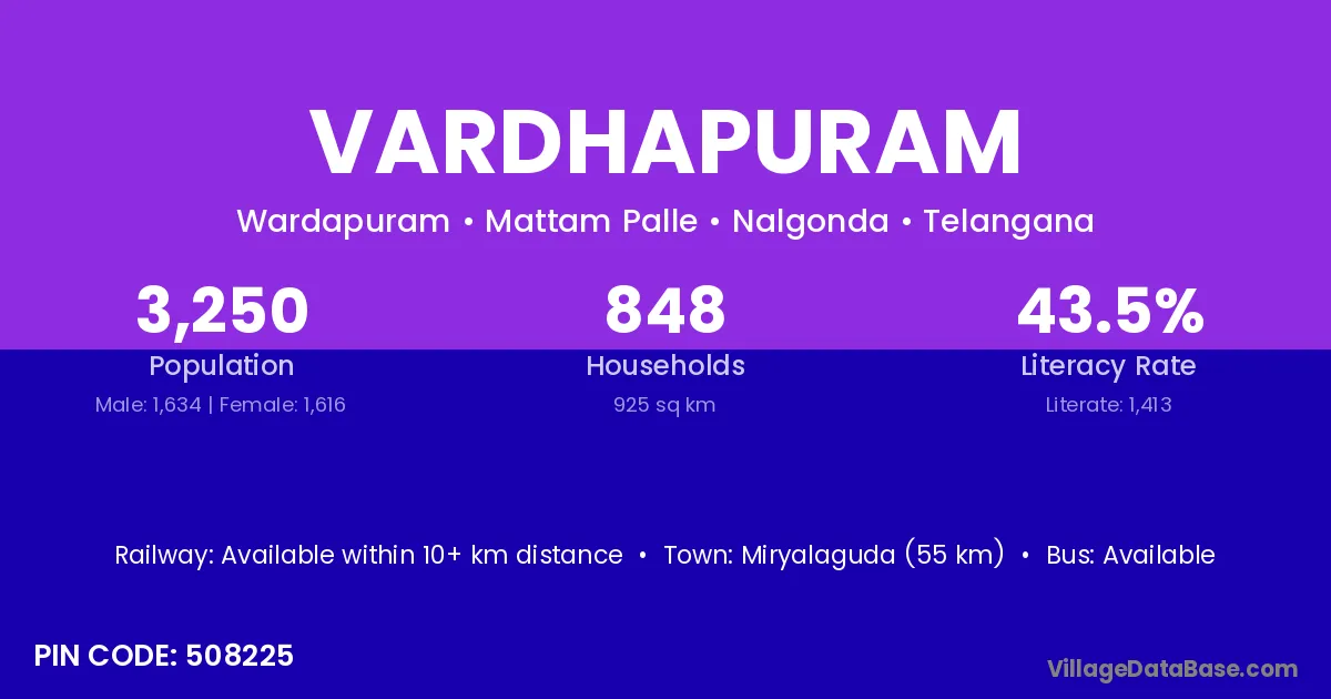 Miryalaguda (55 km) is the nearest town to Vardhapuram village for major economic activities and is located approximately 55 km away.
