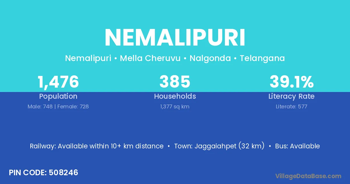 Jaggaiahpet (32 km) is the nearest town to Nemalipuri village for major economic activities and is located approximately 32 km away.
