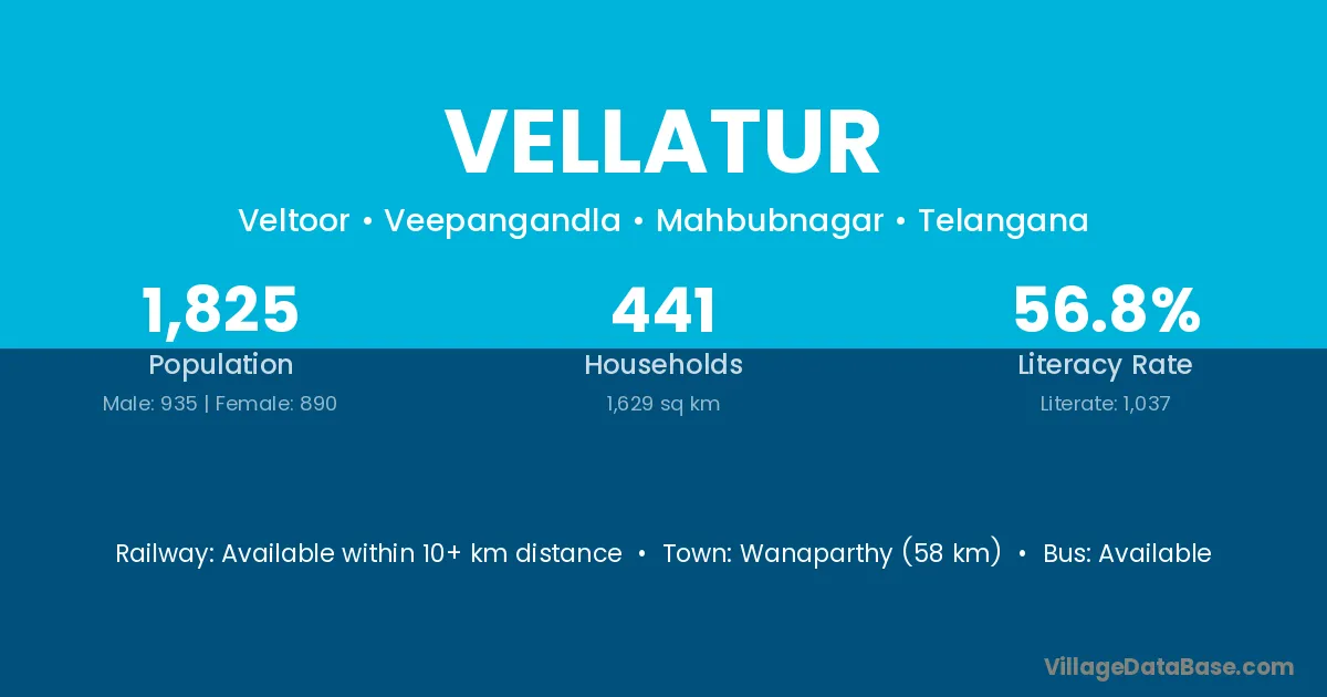 The literacy rate of Vellatur village is 43.12%. Male literacy stands at 49.41% and female literacy at 36.91%.