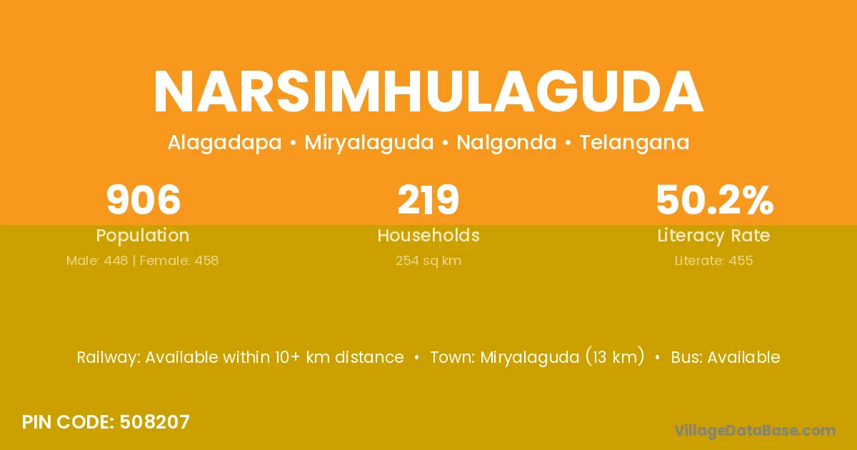 Miryalaguda (13 km) is the nearest town to Narsimhulaguda village for major economic activities and is located approximately 13 km away.