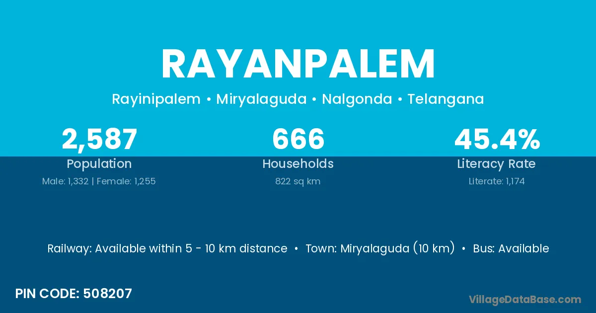 Miryalaguda (10 km) is the nearest town to Rayanpalem village for major economic activities and is located approximately 10 km away.
