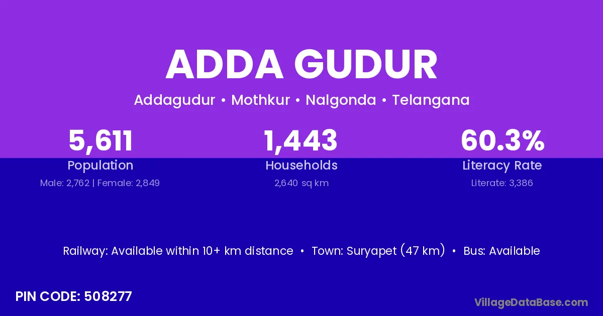 Suryapet (47 km) is the nearest town to Adda Gudur village for major economic activities and is located approximately 47 km away.