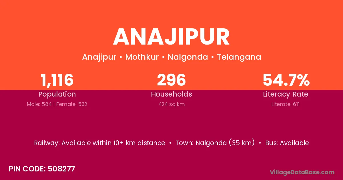 Nalgonda (35 km) is the nearest town to Anajipur village for major economic activities and is located approximately 35 km away.