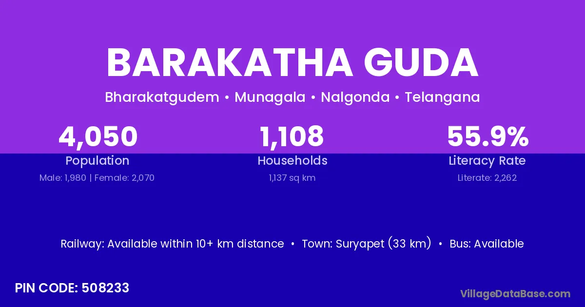 Suryapet (33 km) is the nearest town to Barakatha Guda village for major economic activities and is located approximately 33 km away.