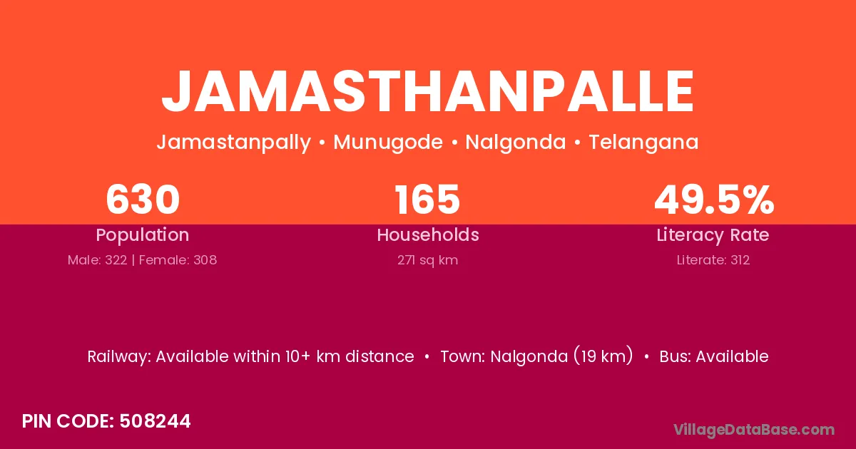 Jamasthanpalle village has a total population of 630 people, of which 322 are males and 308 are females.