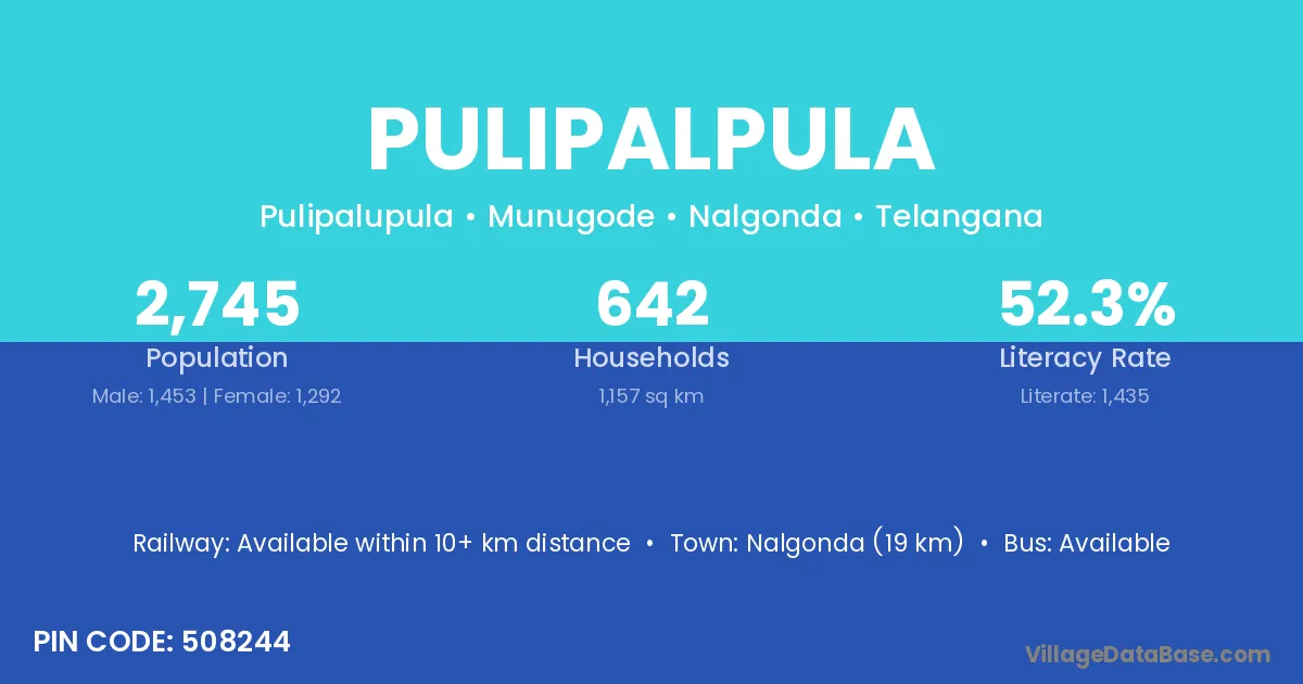 Nalgonda (19 km) is the nearest town to Pulipalpula village for major economic activities and is located approximately 19 km away.