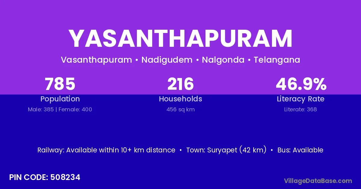 Suryapet (42 km) is the nearest town to Yasanthapuram village for major economic activities and is located approximately 42 km away.