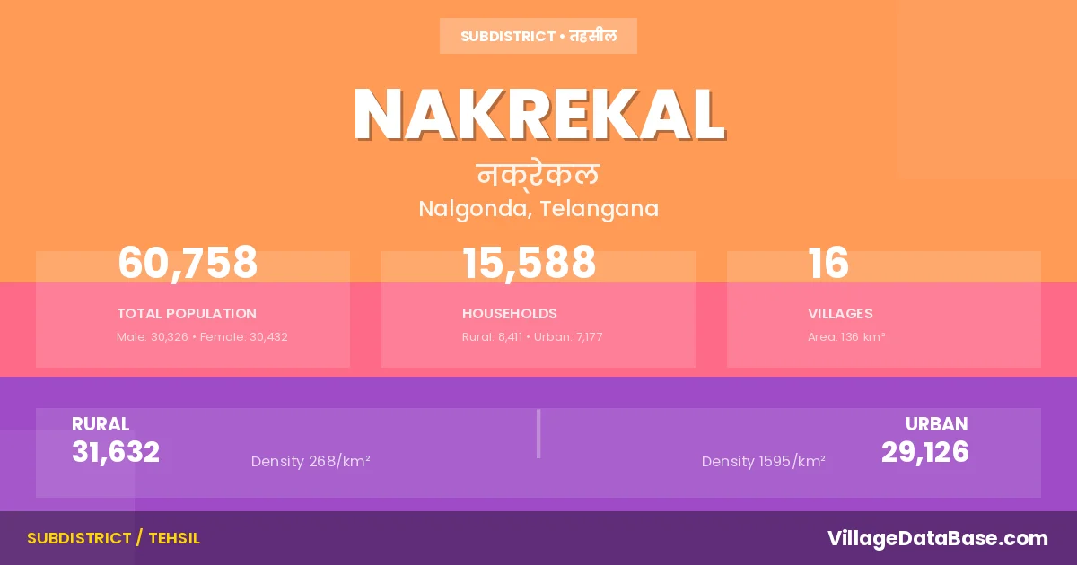 According to the 2011 census The total area of Nakrekal Mandal is 136 km², with a population of 60758 people. The population density is 445 inhabitants per square kilometre, and there are approximately 15588 houses in the sub district.