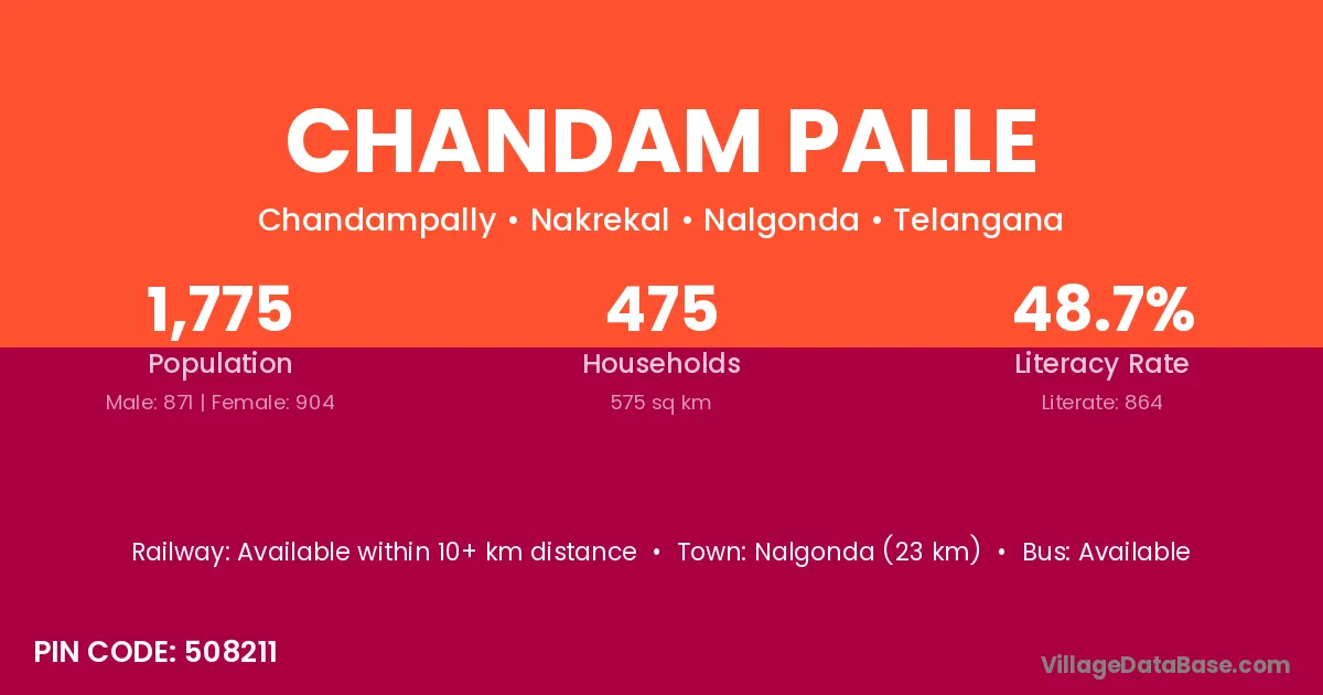 Nalgonda (23 km) is the nearest town to Chandam Palle village for major economic activities and is located approximately 23 km away.