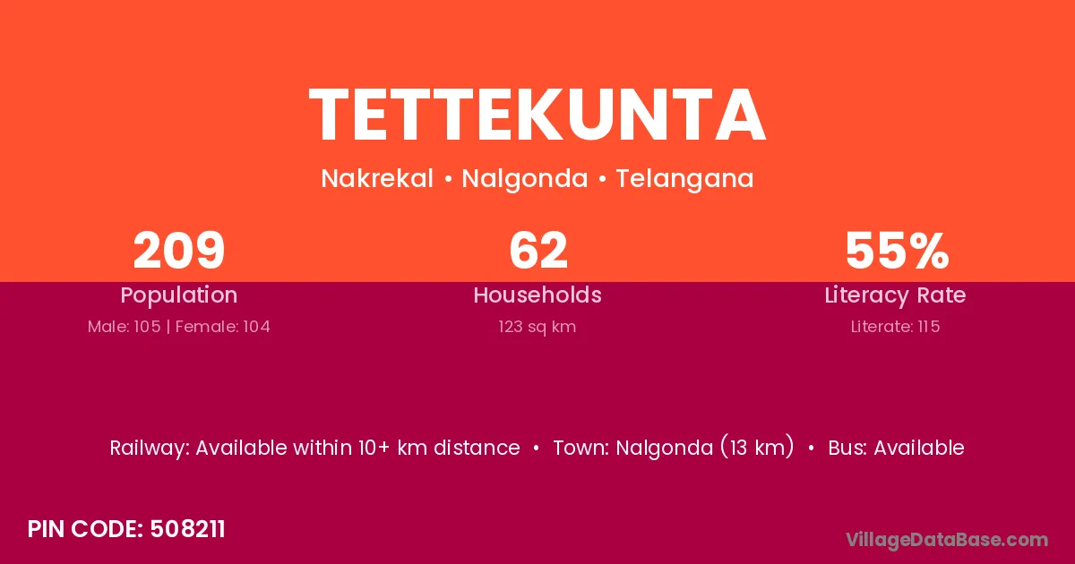 Nalgonda (13 km) is the nearest town to Tettekunta village for major economic activities and is located approximately 13 km away.