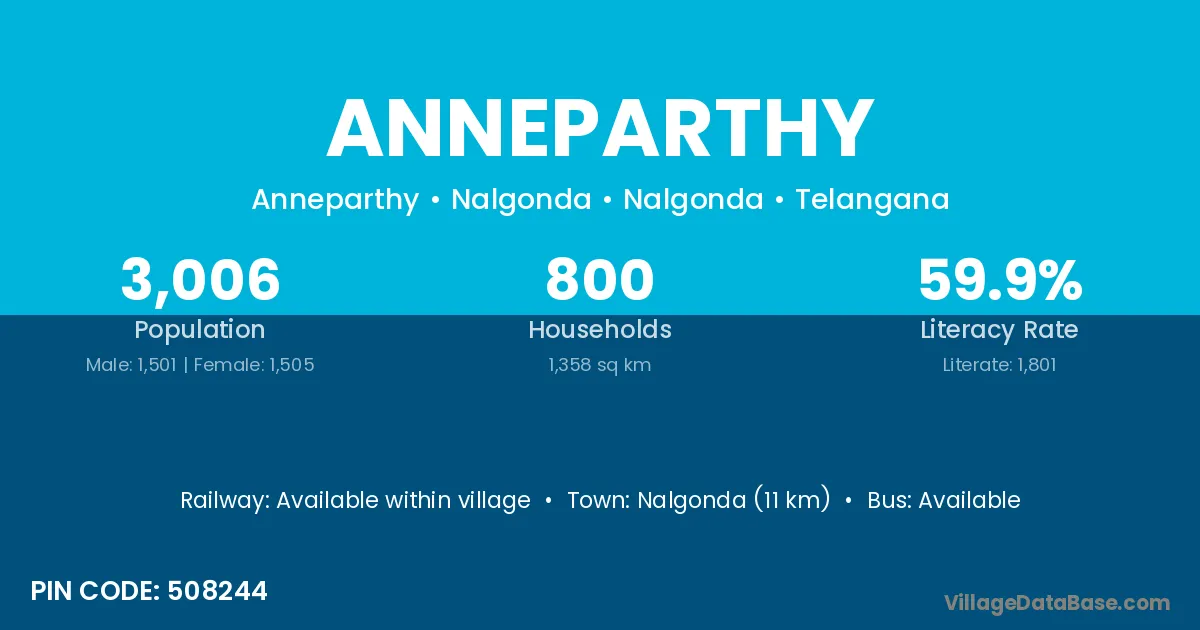 Nalgonda (11 km) is the nearest town to Anneparthy village for major economic activities and is located approximately 11 km away.