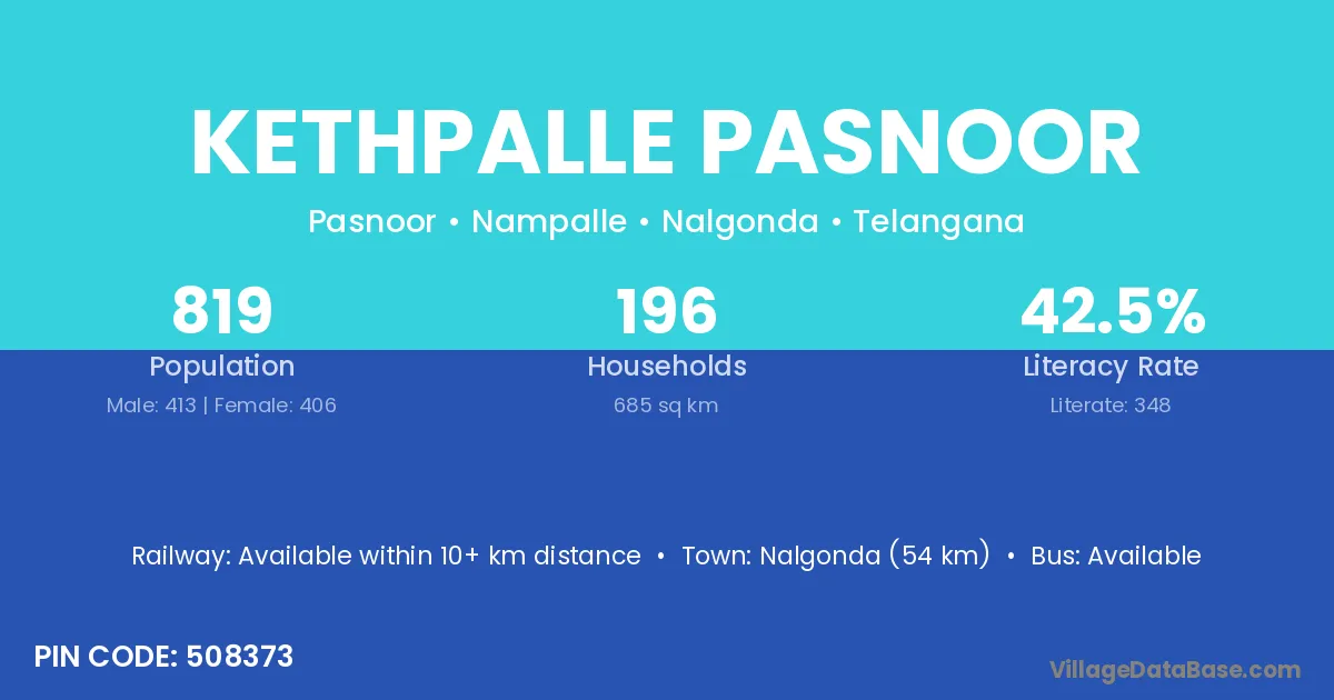 Kethpalle Pasnoor village has a total population of 819 people, of which 413 are males and 406 are females.
