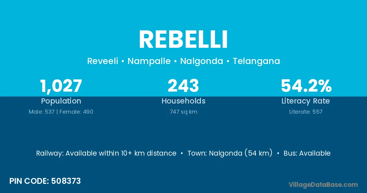 Nalgonda (54 km) is the nearest town to Rebelli village for major economic activities and is located approximately 54 km away.
