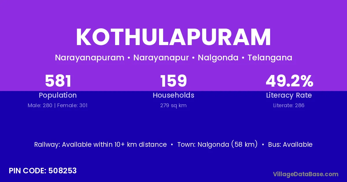 Kothulapuram village has a total population of 581 people, of which 280 are males and 301 are females.