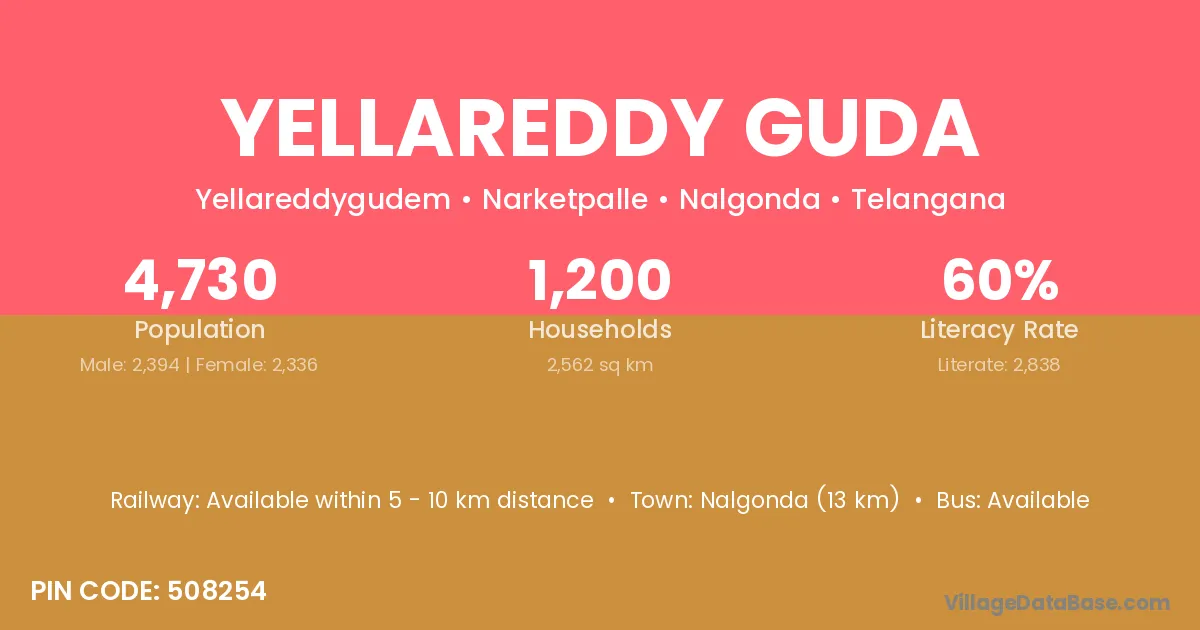 Yellareddy Guda village has a total population of 4,730 people, of which 2,394 are males and 2,336 are females.