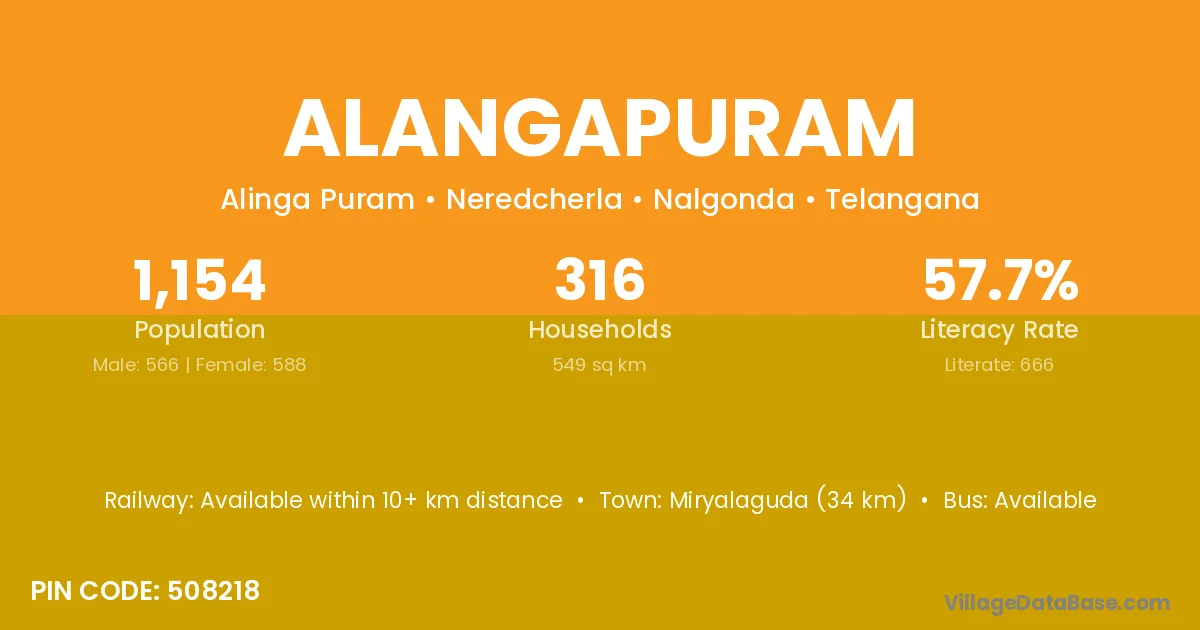 Miryalaguda (34 km) is the nearest town to Alangapuram village for major economic activities and is located approximately 34 km away.