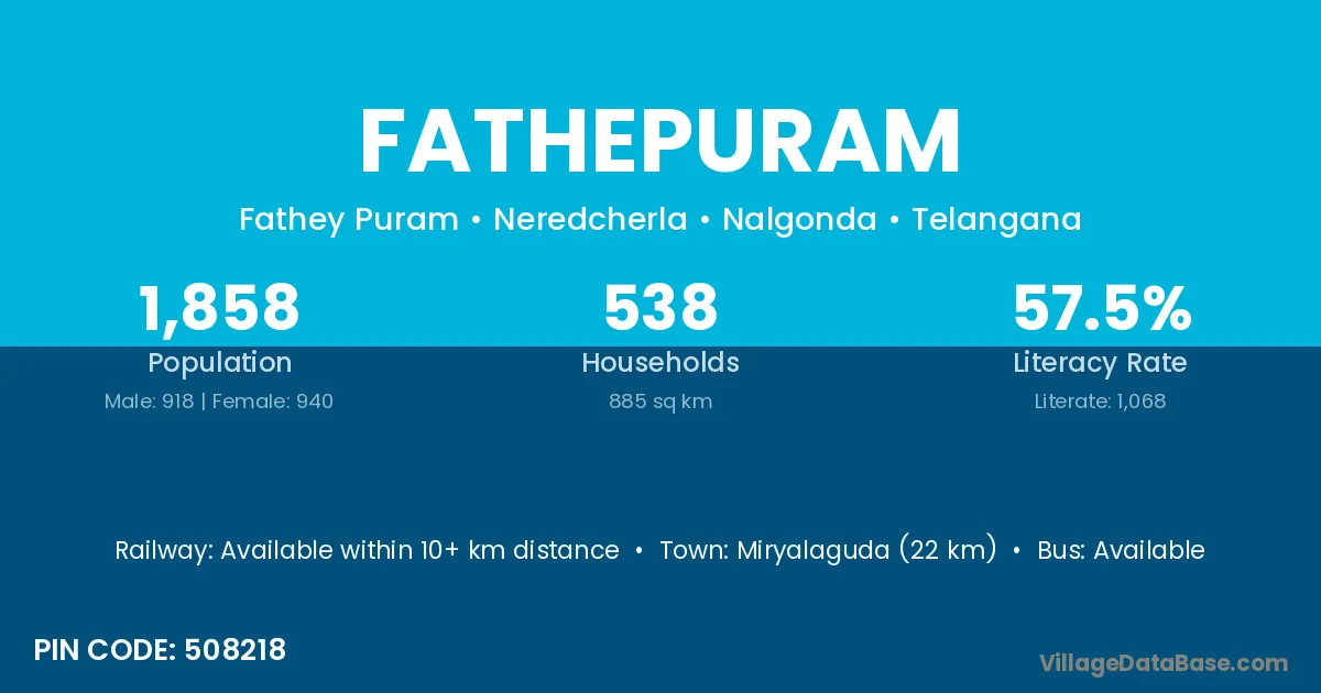 Miryalaguda (22 km) is the nearest town to Fathepuram village for major economic activities and is located approximately 22 km away.