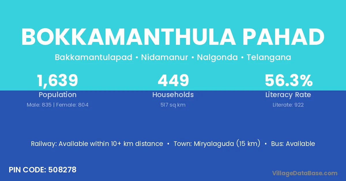 Miryalaguda (15 km) is the nearest town to Bokkamanthula Pahad village for major economic activities and is located approximately 15 km away.
