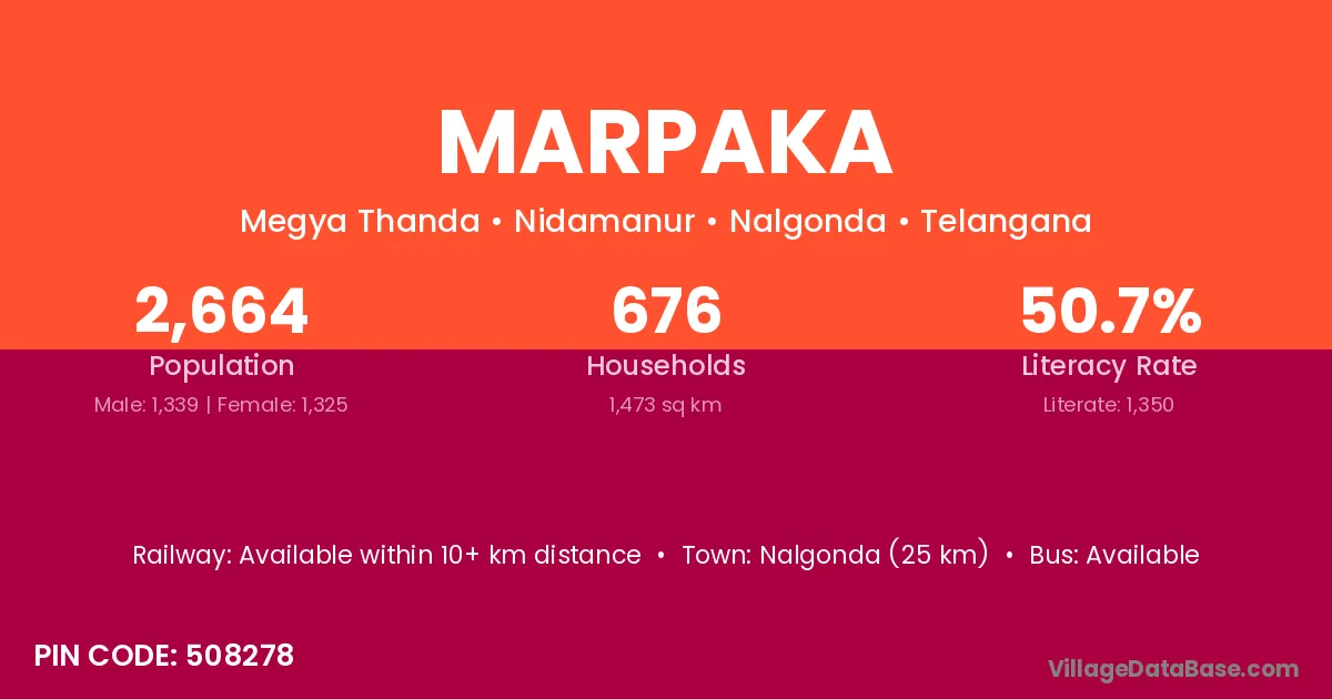Nalgonda (25 km) is the nearest town to Marpaka village for major economic activities and is located approximately 25 km away.