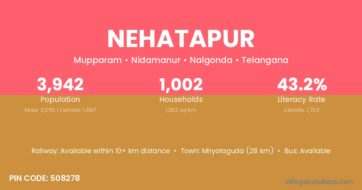 Miryalaguda (28 km) is the nearest town to Nehatapur village for major economic activities and is located approximately 28 km away.