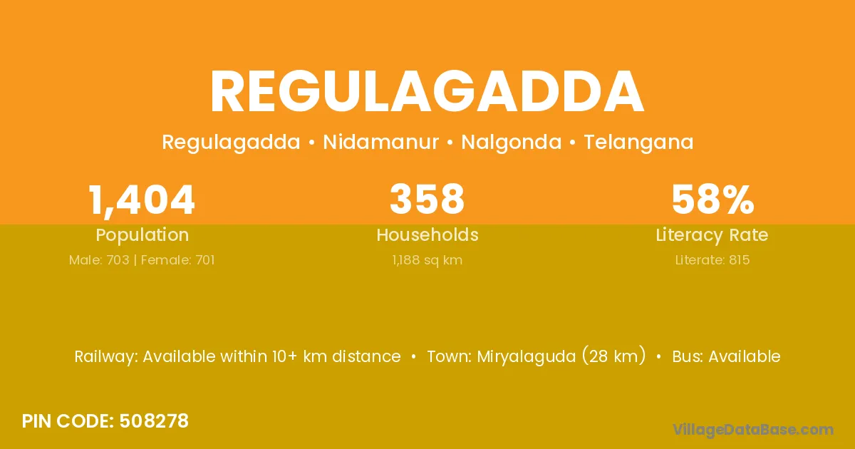 Miryalaguda (28 km) is the nearest town to Regulagadda village for major economic activities and is located approximately 28 km away.