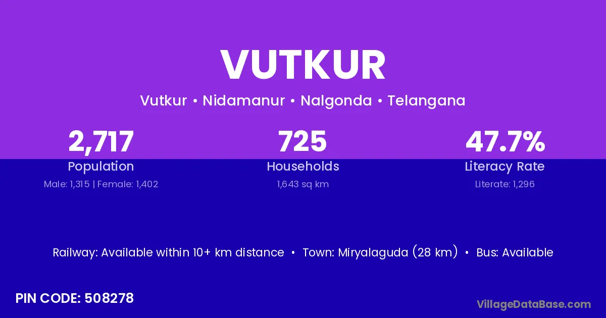 Miryalaguda (28 km) is the nearest town to Vutkur village for major economic activities and is located approximately 28 km away.